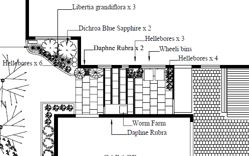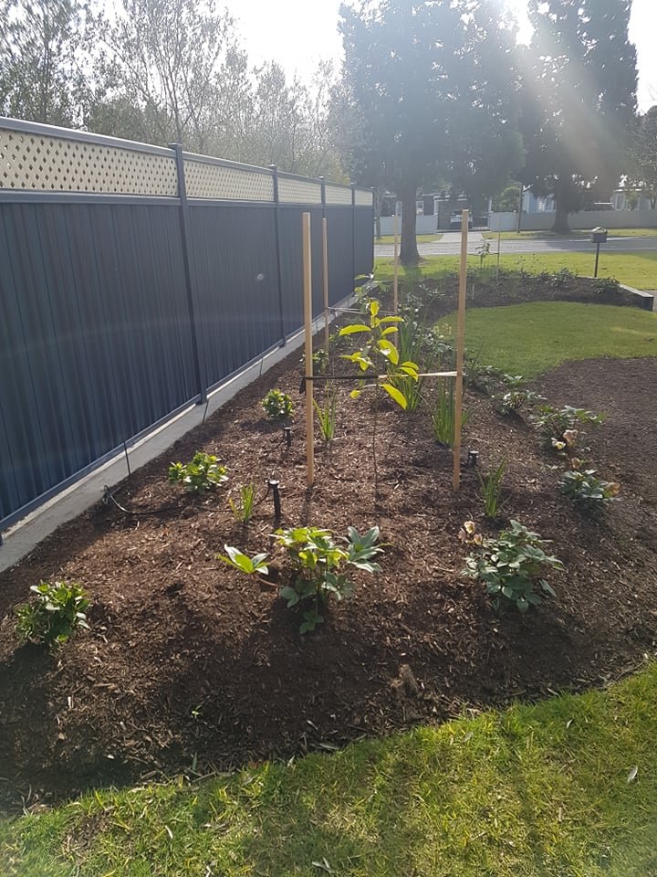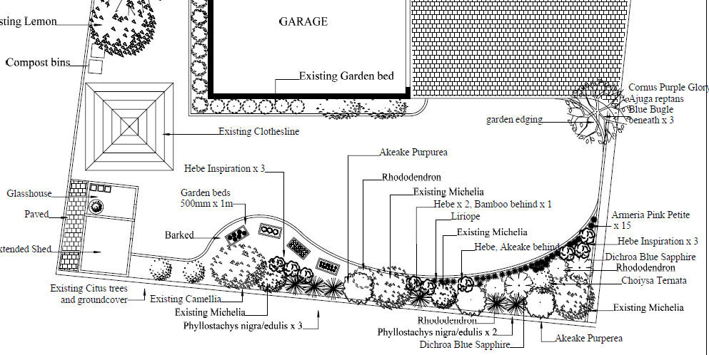 The existing vege gardens were on the lawn, making mowing a nuisance so I moved them into the garden to eliminate having to weed eat around them. I suggested plants that would provide some height to afford privacy from the neighbours on a higher site behind while staying contained in the garden.